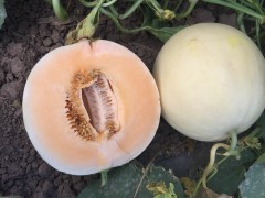 。早中熟厚皮甜瓜品种,长势健壮,抗性强。乳白皮桔红肉,果实圆至高形。花后32~35天成熟。表面光洁、充分成熟果皮白里透红,肉厚4.0~5cm,肉质脆,多汁甘甜,折光糖15~17%。单瓜重2~2.5kg。管理得当一般亩产3000~4000kg。熟后不落蒂,皮薄质韧、耐贮运、商品性好,适合各地保护地及西北干旱地区露地栽培。