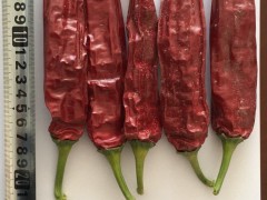 加工型早熟杂交种,无限分枝类型。株高70厘米左右,株幅50~60厘米,第一花着生节位11节,结果集中,座果能力强,果实羊角形,果长20厘米左右,果实横径3.5厘米左右,干椒单果重8~9克,单株座果数30个左右,青果绿色,成熟果深红色。维生素C含量137毫克/千克,辣椒素含量0.012%,色价370ASTA。感病毒病CMV,感病毒病TMV,抗疫病,中抗炭疽病,中抗细菌性斑点病,耐热性强,抗倒伏能力强。第1生长周期亩产530.66千克,比对照蓓蕾一号增产18.36%;第2生长周期亩产548.75千克,比对照蓓蕾一号增产19.39%。干椒亩产800~820公斤。