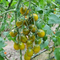 黄绿色樱桃番茄,无限生长类型,植株长势中等,单果重25克左右,短椭圆形,成熟后果实绿肩明显,番茄风味浓郁(Brix 8.5),抗烟草花叶病毒,黄化曲叶病毒,斑萎病毒,叶霉病,根结线虫,适宜保护地早春、秋延、越冬种植。