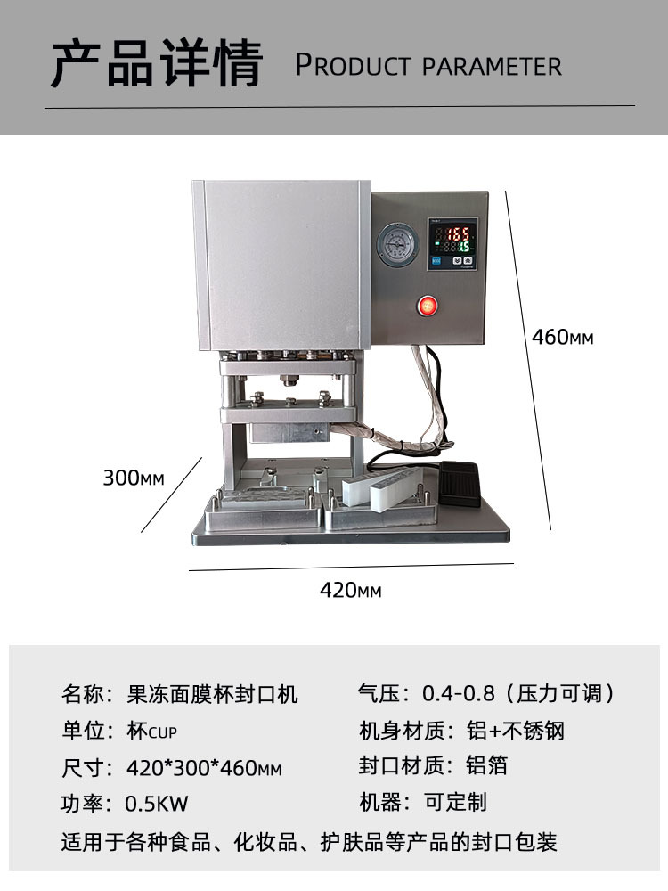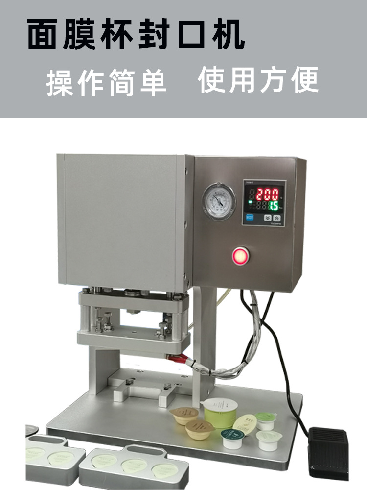 机器特点:铝加304机体,设备轻便,操作简单,适用于面膜杯、 试管等小口径片膜封口,底模具可移动,可做多个底 模多人生产。